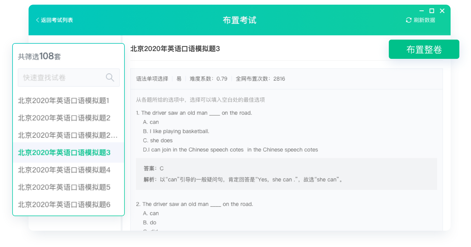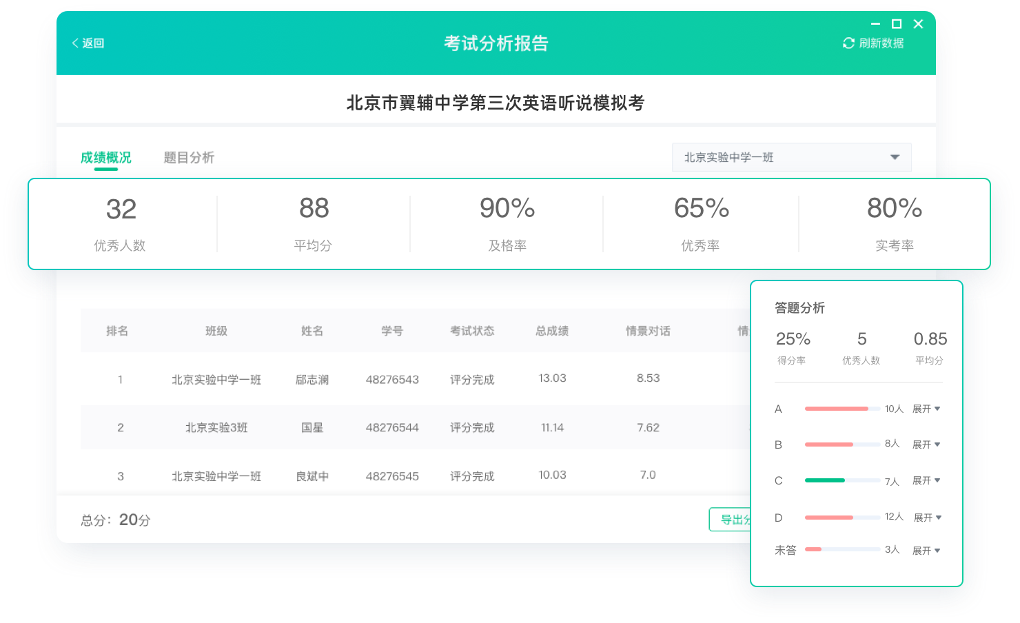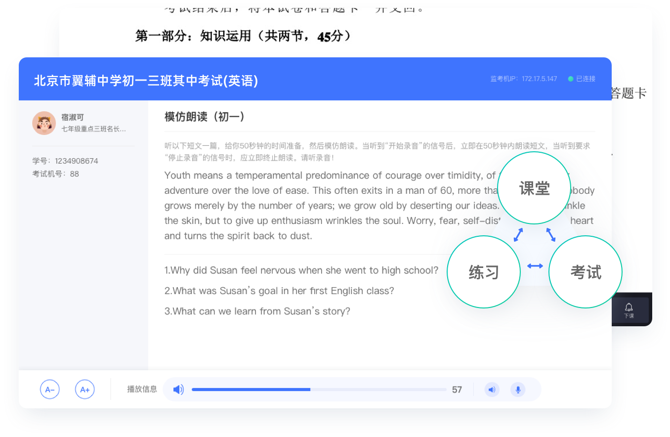 综合利用学校现有机房,运用先进的云计算、人工智能语音评测技术,结合优质的听说试题资源,为开展日常英语听说教学和练习,组织阶段性听说模拟考试营造良好环境