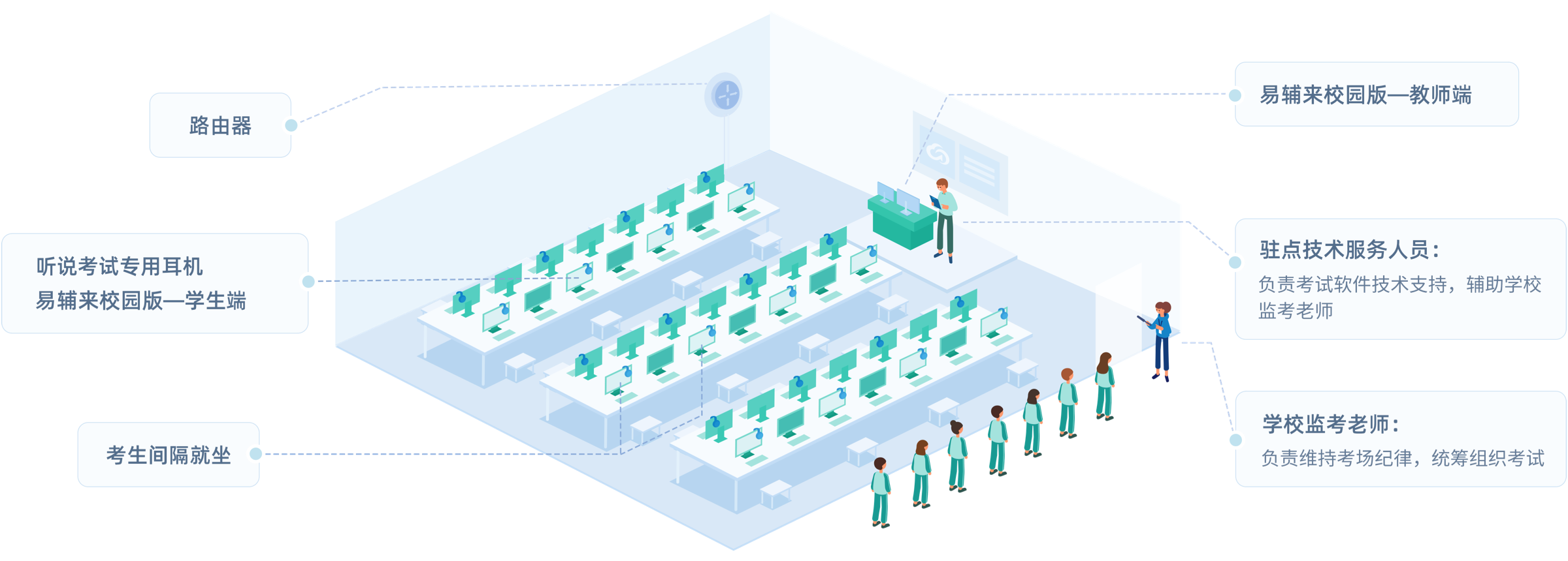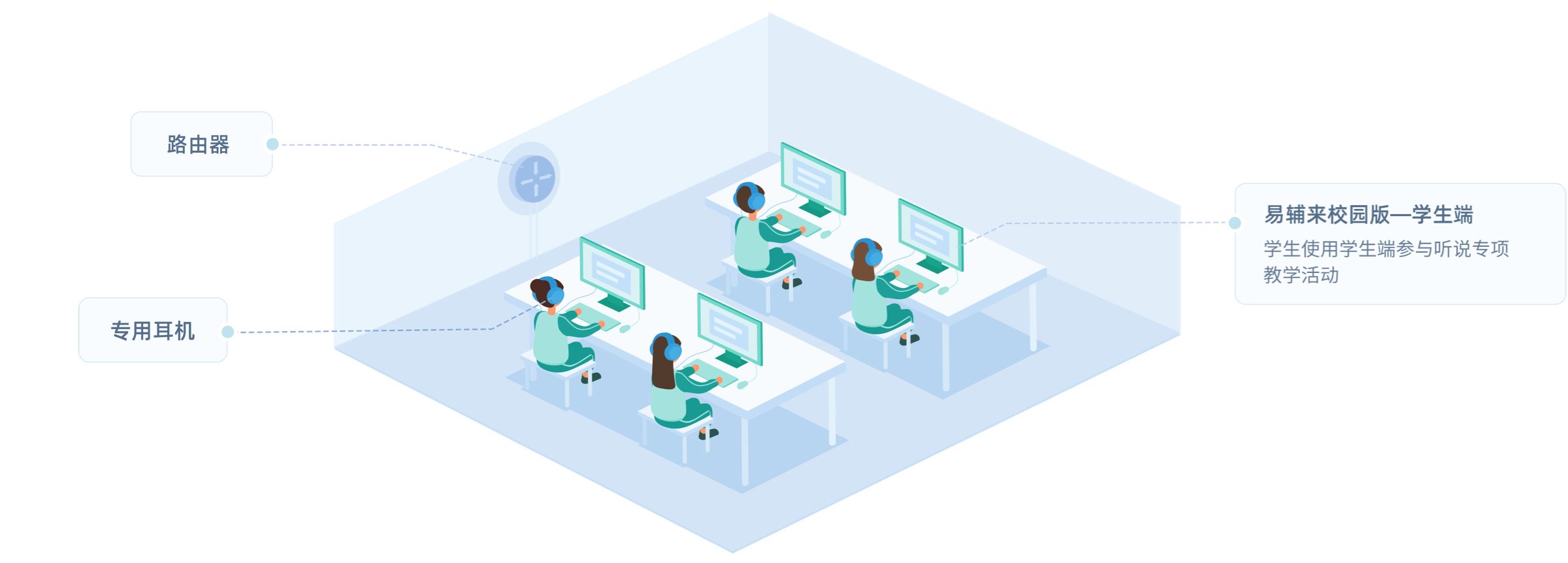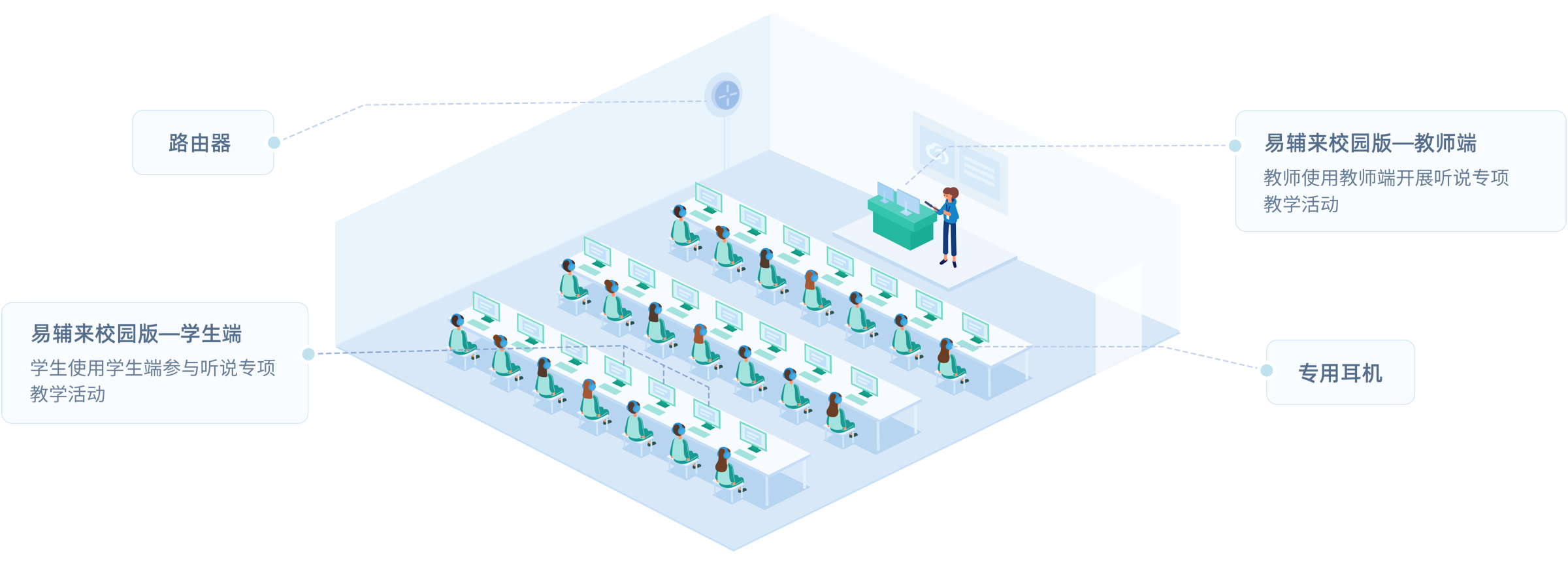 易辅来校园版是面向学校机房教学场景的英语听说专项能力教考软件系统,为提升区域或学校英语教学质量、改善听说素养提供解决方案